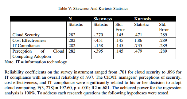 Ha3: There is a correlation between CIO/IT managers’ decisions to adopt cloud computing and their perceptionsregarding IT compliance. There was a significant, strong, positive relationship between CIO/IT managers’ decisions to adoptcloud computing and their perceptionsregarding IT compliance, r = .756, N = 282, p< .001, two-tails. Therefore, H03 is rejected.