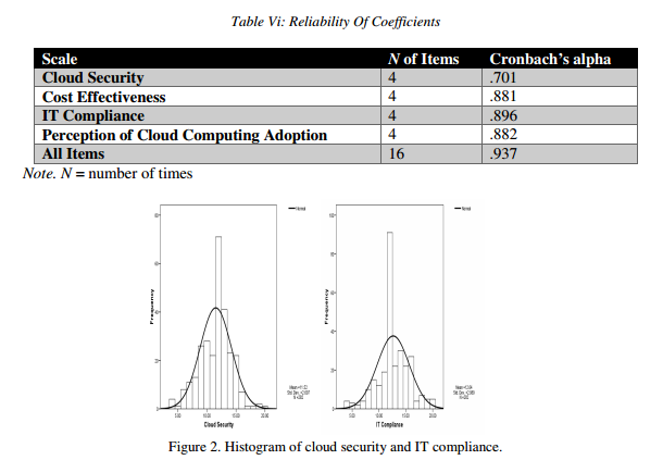 The research design was non-experimental; however, the approach was quantitative exploratory. The instrument for the study survey was modeled after previously validated study instruments with five parts consisting of demographic information, management’s perception, security, cost effectiveness, and IT compliance[13].Exploratory factor analysis was used to explain the existence of dependency among perceptions of cloud adoption, cloud security, cost effectiveness, and IT compliance variables being measured by the survey instrument. Factor analysis reveals the structure of variables, and reduces independent variables to a manageable size by determining their relationship to the dependent variable, which relationship is the perception of cloud adoption in this study, while leaving the original design intact to test for negative correlation[14]. Negative Cronbach’s alpha can be realized as a resultof a reverse phrase in an item or rewording of a question, and is used to reduce response bias.