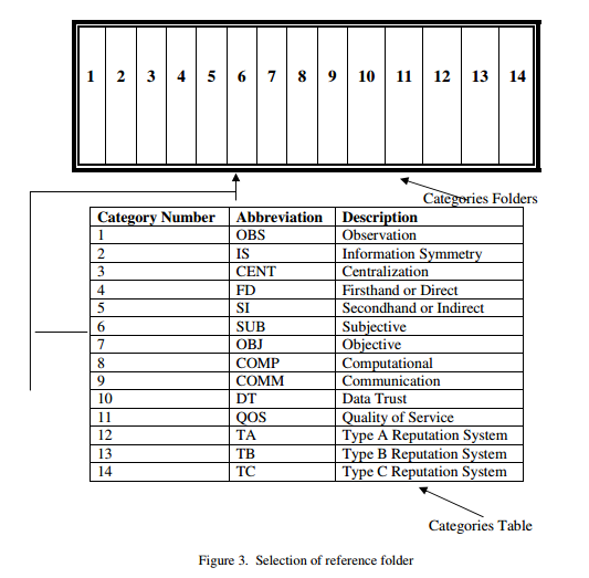 Designing a scheme for characterization of reputation and trust begins with naming the categories to help identify each class. Several classes have been identified as indicated in Table 1 . The first column provides the category number. The second column indicates the abbreviation for the third column, which provides the description of each category. A total of fourteen reputation and trust categories were identified. This number equates to fourteen clearly labelled folders. After identifying the categories, a filing system was designed that will group research papers based on each category which allows for ease of reference. The reference filing system consists of approximately fourteen (14) folders each labelled as indicated in Table 1. After inserting the research papers containing the corresponding categories into the appropriate folders, the following series of steps must be followed to obtain the required information for the specific category: