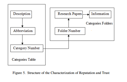 The overall structure of the characterization of reputation and trust is illustrated in Figure 5. From the categories table, the description of the trust or reputation is used to obtain the folders from which the research papers containing the trust or reputation information can be found. The categories table is divided into three columns: description, abbreviation and category number.