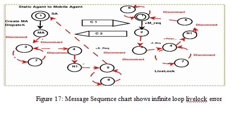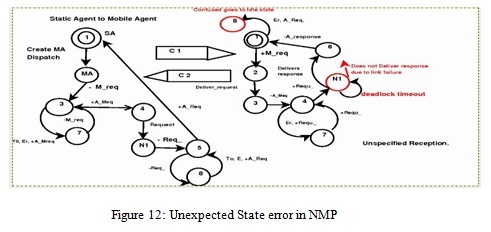 Deadlock is a scenario, whereby state machines cannot progress to another state because they are waiting for an event that will never occur. Static Agent sends creates Mobile Agent and dispatches, due to the failure of the node, Mobile Agent does not respond to the request of Static Agent. Static Agent waits for random time and time out occurs and again sends request to Static Agent and again goes to wait state. So both the state machines cannot progress further waiting for event to occur that never happens. Hence Deadlock occurs as seen in figure 10. Referring to the Message sequence chart, we can see that Static agent send the request to Mobile Agent. Due to failure of Mobile Agent node, it does not respond. Static agent waits for certain time. Time out occurs and again new request is sent from Static Agent and again goes to wait process expecting Mobile agent to respond, which does not happen. So state machines cannot progress further waiting for event to occur, that never happens. Hence Dead lock occurs. Figure 11 shows the MSC of NMP that indicates Deadlock, where 2 process cannot progress further waiting event to occur.