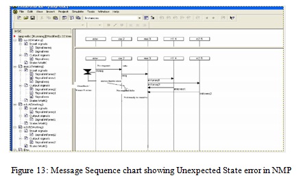 Use of timers may prevent deadlocks, but their use may result in states that are never reached if the specification is faulty[9]. In our simulation, When there was no request from environment, Static Agent is in idle state. Once the request comes from environment , Static Agent sends request to Mobile Agent. Mobile agent goes to Nodes and collects their status. In this case error will propagate because a generic deadlock timer expired that was unaware of the state specific actions to take at this point. So due to ambiguity, Static Agent is not in position to decide what state it should be, hence goes idle. Even through Mobile Agent is ready with node status, Static Agent is not a possible to accept the information as shown in figure 12. Figure 13. shows the MSC indicating the unexpected state error due to ambiguity.