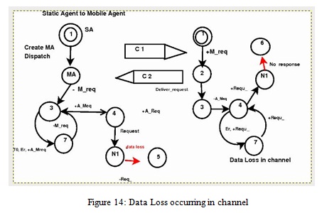 As indicated in figure 14, request from Node1 gets lost in channel and no response from Mobile Agent regarding status of the Node. Figure 15. shows that Request sent by Static Agent to Mobile Agent and request gets lost in the channel, Response comes from only from Node2 to Mobile Agent. Data loss occurs, when one or more packets of data travelling across a network fail to reach their destination. Data loss can be caused by a number of factors, including packet drop because of channel congestion, rejected corrupted packets, faulty networking hardware. As seen in the figure 16, it shows that the data loss increases if more number of packets are sent. Hence throughput will be less due to the number of retransmission.
