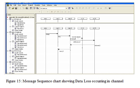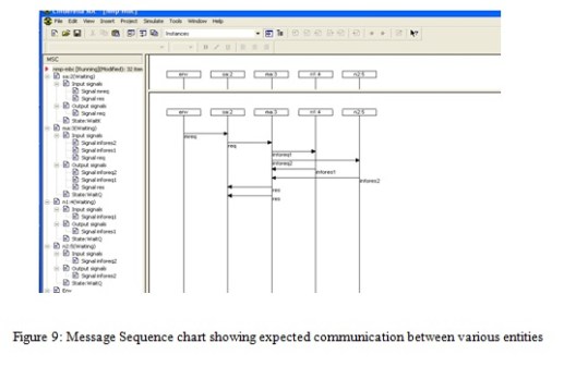 Presence of such dead-locks or live-locks reveals that Node Monitoring Protocol system does not behave as expected that can be monitored using Message sequence chart that is generated after simulation. MSCs are another valuable description technique for visualizing and specifying inter-system, asynchronous component interaction[7]. MSC strength lies in their ability to describe communication between cooperating processes. There are arrows representing messages passed from a sending to a receiving process.