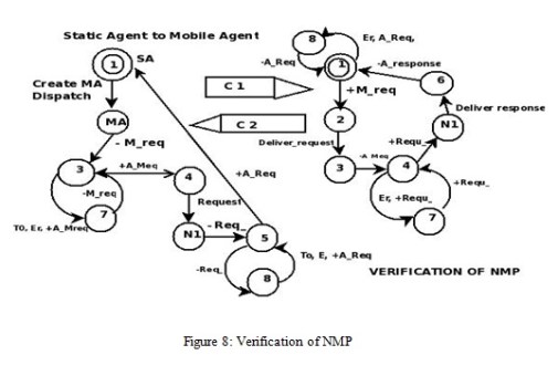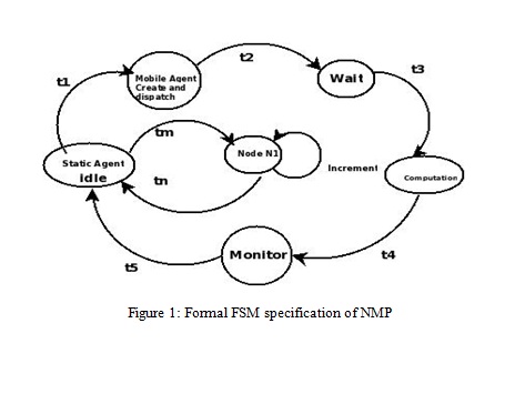 An Finite State Machine M, is a 5-tuple A=(I, O, S, T, F) I is the Input, O is the output and S is the states and F is the finite sets. The main system which runs at the central node, where Static Agent is deployed for collection of network status information. The Mobile monitoring system is status monitoring segment, which runs in the migrated Mobile Agents. Figure 1. shows the State transition sequence that illustrates that NMP is capable of delivering data without duplication and in right order. Initially Static Agent which resides in the main segment in idle state then if requests arise, creates Mobile Agent and dispatches sending request M req to monitor the status of the node, initiating the timer. Even if channel loses Mreq, time out occurs triggering retransmission. and time channel correctly delivers the message. Now Mobile agent sends Request to Node 1 and in case channel loses the Request, Time out occurs and retransmission of the data takes place. Request goes to Node 1 and Mobile Agent monitors the node collects the status of the Node like node failure, link failure, energy level, throughput etc, and delivers to the Static Agent and goes into idle state again. Many important properties of requirement specifications can be checked during requirements capture. First of all, requirements characterizing the total behavior of a system may be expressed in terms of temporal modalities (dynamic requirements) including safety and liveness conditions.