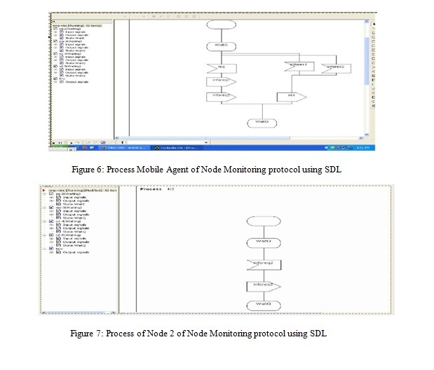 Node2 process as shown in figures 4, 5, 6 and 7 respectively. Signal routes transfer signal immediately while channels may be delaying. The signal specification identifies the name of the signal type and the sorts of the parameters to be carried by the signal such as Mreq, resp, req, inforequest1, inforesponse1, inforequest2, inforesponse2. As seen in the SDL model, Static Agent (SA) behaviour is expressed as a process which exists in a state, waiting for an input (event) triggered from environment. When Mreq signal is sent from environment, SA locates Mobile Agent(MA) and sends a request to collect health of the nodes. We have considered two Nodes N1 and N2 in our case. MA interacts with the nodes and gets node information back to SA. We have to note that such a specification may contain few errors during its design even from the requirements. For this reason, we have used model checking technique like generating Message sequence chart in order to verify our specification. Indeed, before validating an implementation we need to make sure that the used specification corresponds to the requirements. Simulation was done to verify that specification is free from deadlocks and live-locks within simulated space.
