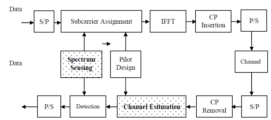 After spectrum sensing, CR adopts NC-OFDM technique that decomposes wideband into orthogonal sub-channels. In NC-OFDM based CR systems, as shown in Figure 2, the sub-channels are activated when the spectrum is idle and when it is not available corresponding sub-channels are deactivated (set to zero). The data stream is only assigned to active sub-carriers and pilot design is performed accordingly.