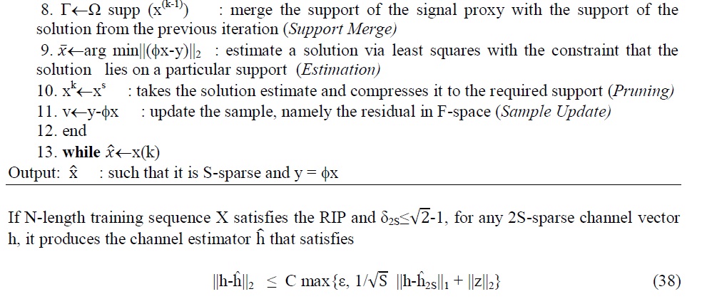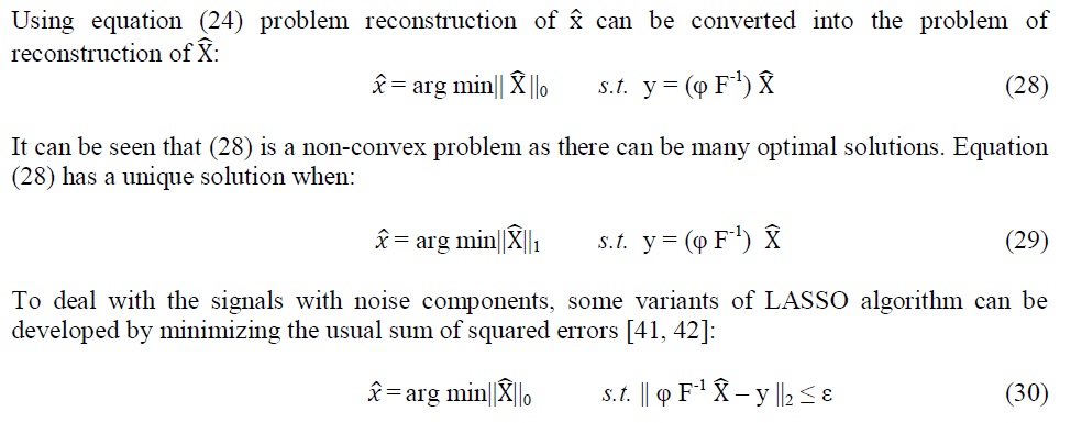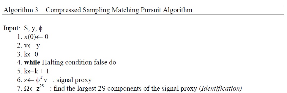 Convex optimization techniques can be used for the sparse signal recovery with high probability. CS relied on the assumption that equation (4) provides the correct solution and is computationally not complex. However work has been done to find alternative algorithms those can be easily implemented, faster and give better reconstruction performance, such as Matching Pursuit (MP) [29] and OMP [30] algorithms, which can be fast and easily implemented. There also exist a variety of different kinds of iterative algorithms such as Compressed sampling Matching Pursuit (CoSaMP), iterative hard thresholding (IHT), and various similar thresholding algorithms for improved compressed signal reconstruction [31-37]. These algorithms are based on similar structure can be easily understood by identifying the locations of the nonzero coefficients of a and then estimating the values of those coefficients.