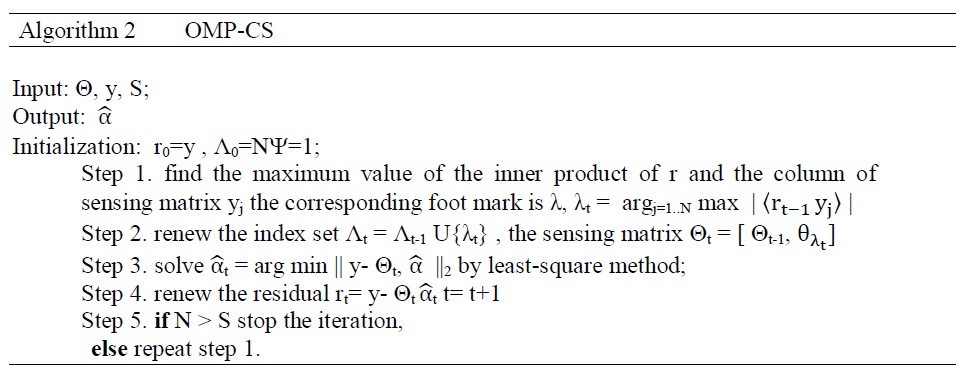 OMP algorithms suggests the reconstruction under the conditions of a given iteration number, as the iterative process is forced to stop, OMP algorithm needs a lot of linear measurement to ensure accurate reconstruction. The basic idea of the OMP algorithm is to select the columns of Θ with greedy iterative algorithm, make sure the correlative value between the columns selected in each iteration and the current redundant vector is maximum, and then subtract the correlative value from the sampling vector and repeat iteration until the number of iterations achieves the sparse degree S. Here, Θ is sensing matrix, y is sampling vector, S is sparse degree, r is residual and Λ is the index set . Output of the OMP algorithm is the S-sparse approximation α ̂ of α.
