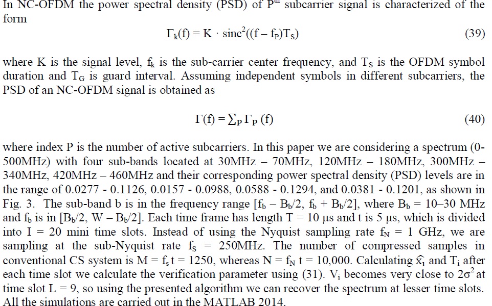 Additionally, Malioutov et al. [15] described a stopping rule for a desired tolerance in reconstruction for the near-sparse case. Simin Bokharaiee et al. [16] applied cyclic prefix correlation coefficient (CPCC) based blind spectrum sensing for orthogonal frequency division multiplexing based cognitive radio (OFDM-CR) systems. Furthermore, by considering multipath correlation in the generalized likelihood ratio test (GLRT) algorithm and employing the inherent structure of OFDM systems a low complexity algorithm was obtained. Furthermore, M. Farrag et al. [17], proposed Distributed Sensing Matrix (DSM) based algorithm to reduce complexity at each sensing node and improve the unlicensed users i.e. primary users’ (PUs) detection performance.