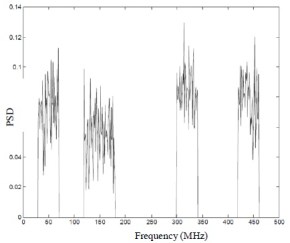 As can be observed from Figure 3, the wideband signal contains the PSD. Using algorithm 1 for fast and efficient compressed sensing, wideband spectrum can be successfully recovered, as shown in Figure 4 and terminate the signal acquisition at comparatively lesser time slots leading to a fast efficient spectrum sensing.