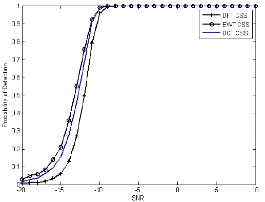 Figure 6.Performance comparison of DFT CSS,DCT CSS and proposed EWTCSS spectrum-sensing algorithms