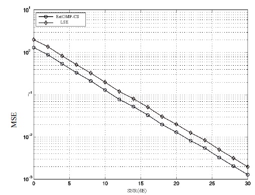 Figure 7 depicts the MSE versus SNR. It can be seen from the figure, that the CS-based scheme significantly outperforms the least-squares method. Compared with the least square scheme with 1024 pilots, CS based scheme with 511 pilots shows only a small performance degradation