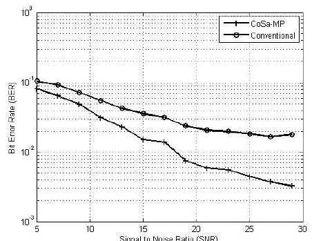 Figure 8 shows BER performance of two schemes- proposed CS channel estimation and channel estimation scheme based on LS. Improved BER performance of the proposed CS based scheme can be seen from the above figure, over the conventional LS based scheme.