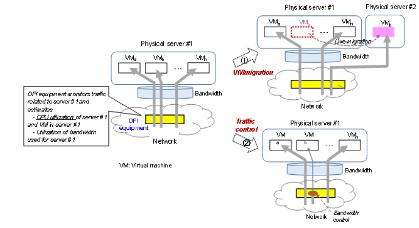 First, this paper proposes an example of server congestion control method, in which the DPI equipment estimates the CPU usage of each server by constantly monitoring the number of TCP live connections established by each server, and moves some of virtual machines on the congested server to other servers through remote control timely. Next, this paper proposes an example of reducing power consumption by servers, in which the DPI equipment constantly monitors the traffic sent or received in each area with multiple servers. Finally, the feasibility of the proposed approaches is demonstrated by an evaluation system with a real DPI equipment.