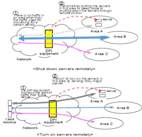 An image of reduction of power consumption by servers with DPI technology is illustrated in Figure 2. In this example, the DPI equipment installed in the network constantly monitors the volume of traffic carried in areas A, B and C. Each area has multiple servers. When the DPI equipment detects an area that carries no traffic except for monitoring packets, it either puts all servers in the area to sleep mode or shut them down. On the contrary, DPI equipment remotely turns on the server with Wake-on-LAN (WOL) [12], when it monitors the start of traffic flow to the server. This approach could reduce power consumption simply and timely, compare with the conventional method with maintenance staffs.