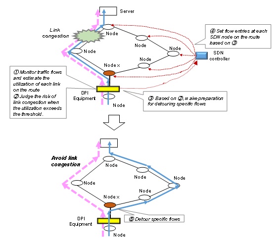 An image of link congestion control with DPI technology is illustrated in Figure 3. The DPI equipment in the network monitors traffic flows and estimates the utilization of each link on the route. If the utilization exceeds the threshold, DPI equipment judges the risk of link congestion and makes a preparation for detouring specific flows on another non-congested route. Assuming SDN-based network [13],[14], DPI equipment requests SDN controller to set flow entries at each SDN node (switch) on the alternate route. Then, node x in this example detours specific flows to the alternate route and it could avoid link congestion. These approaches can avoid link congestion in the network simply and timely, compare with the conventional method with maintenance staffs.