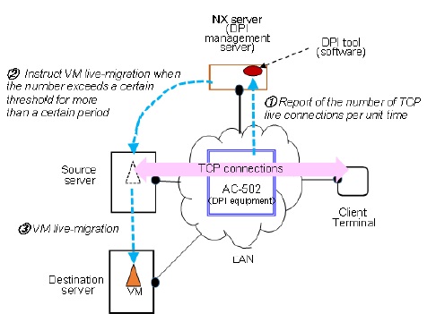 2) When the number of TCP live connections exceeded 55 (this is determined based on data in Table 1) continuously for 3 minutes on end, a VM on the source server is moved (live-migration) to destination server. The evaluation tool installed in an NX server remotely instructs both the source and the destination server to migrate virtual machines, with PsExec[17] from Microsoft.