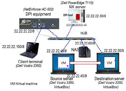 Figure 7 illustrates the actual evaluation system constructed. Dell PowerEdge T110 with Windows Server 2008 is used as NX server, and Dell Vostro3350 (Intel Core i3, CPU 2.27GHz) is used as client terminal and servers. VirtualBox [16] is used as a virtual system, and both host OS and guest OS are Windows 7.