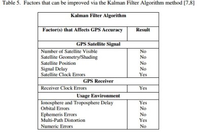 The Kalman Filter Algorithm was used by Qi [7] and Malleswari [8] to minimize some of the factors that affect the accuracy of GPS. Table 5 shows the common factors that affect the accuracy of GPS which can be minimized by this algorithm.