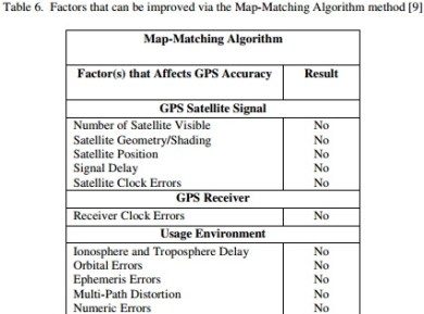 The Map-Matching Algorithm was used by Alain in [9]. This algorithm was used by Alain to improve the accuracy of user’s location in a GPS based system. According to Alain [9], this algorithm is applied to the GPS based system so that the user’s location which is not accurate can be reconciled with a map/network which is not accurate as well. Hence, the factors that affect the GPS accuracy cannot be minimized by using the algorithm as shown in Table 6.