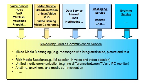 Although broadly Voice, Video, Data, and Messaging have typically been the predominant services used, there have been many applications under these broad categories of services that require different quality of service (QoS) and user experience. For example, as part of video service, broadcast video and video on demand need different QoS. In addition, there is service convergence in the sense that these different services can be supported by a single end user device (e.g., smart phone), rather than dedicated device to support specific service (e.g., TV for broadcast video, telephone for voice call) as in the past. For example, messaging is no longer a simple textual data, but it could be mixed of data and video. Thus, all different services are converging into rich multi-media services in which the user can access those services any time from any place using a single device, and service is no longer limited to a particular type (such as voice, video, or data). Many new innovative service types are also likely to evolve over time, thus necessitating a mixed/rich media communication service. The following Figure 1 depicts the service convergence that has already happened and is also evolving.
