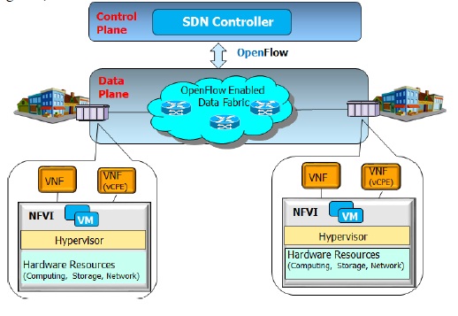 Functionally SDN and NFV are complementary and synergetic even though each can be deployed in an independent manner. SDN focuses on control and L2-L3 data forwarding, whereas virtualization, intelligent edge device, service chaining is supported by NFV. SDN can be used to interconnect many VNF end points (e.g. vCPE) in NFV platform. Figure 6 shows SDN and VNF working together in an integrated way from architectural perspective. VNF equipment can be dynamically reconfigured based on applications and traffic patterns, whereas SDN controller can steer traffic in network elements. In the scenario where orchestration and the management can be VNFs by itself, the OpenFlow protocol can be part of the Nf-Vi interface or Vn-Nf interface (as shown in Figure 6).