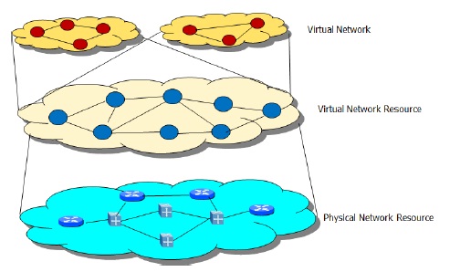 In a high level, vNGN architecture can be viewed and abstracted into three layers, as depicted in Figure 7. The actual physical network infrastructure constituting network element and their inter-connection (as in Figure 3) can be viewed as physical network resource. Physical network in effect provides virtual network resources. Virtual resources can be isolated from each other unless allowed by security policies. Virtual networks can be viewed as logical constructs of the virtual resources implemented on top of physical network. Each customer of a provider network can have one or more virtual networks.
