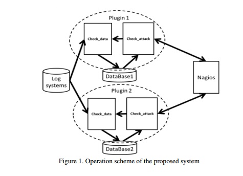 In common case of testing and comparing two DDoS detection mechanisms, it should be implemented in Plugin 1 and Plugin 2. The operation scheme of the system is described in figure 1. Although every detection mechanism is different, all plugins contain two main parts: Check_data and Check_attack. Check_data gets state information of protected system from log systems and processes it. Database stores necessary information written by Check_data and is queried by Check_attack. Check-attack carries out basic calculations of detection algorithms based on data from Database. Results of the calculations are used to make a decision on trigging an alarm in Nagios server.