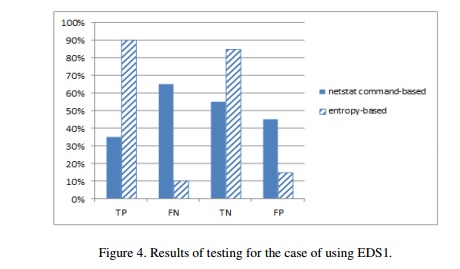 As mentioned above, two plugins were developed, named check_byNetstat and check_byEntropy, and added into Nagios agent in web server. Several EDSs were also specified for testing. The first EDS, called EDS 1, includes chains of 5 seconds of attack interleaved by 10 seconds of non attack, as described in figure 3. By collecting detection results from the proposed testing system, statistics of four quantities TP, FP, TN and FN are illustrated in figure 4.