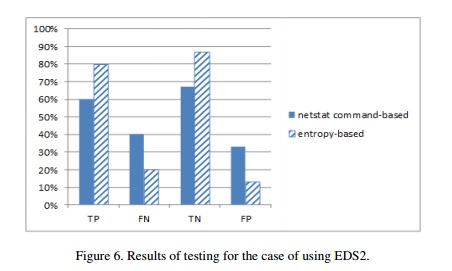 Figure 4 shows that the TP and TN of the netstat command-based mechanism are very low, TP rate of 35% and TN rate of 55%. Conversely, the entropy-based mechanism reaches high rate of TP and TN with 90% and 85%, respectively. Rates of error indication of entropy-based mechanism are also smaller than the rates of netstat command-based mechanism. In the case of using EDS2, period of attacking time is longer than the period in EDS1. In this case, the rates of correct indication of netstat command-based mechanism improved in value with TP rate of 60% and TN rate of 67%, as shown in figure 6. However, rates of FP and FN of netstat commandbased mechanism were still greater than those of entropy-based mechanism. The entropy-based mechanism remains the correct indications of TP and TN in high rate. Thus, entropy-based mechanism is better than netstat command-based mechanism.