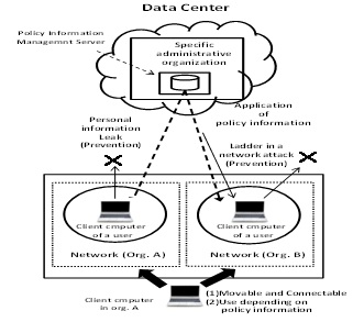 In this paper, the study of the final stages in (Step1) is described. After the completion of this study, we are going to shift to (Step2). The existing PBNM realizes the network management of the own organization based on network policy and security policy. It manages the whole network of the specific organization through communication control (access control, encryption of the communication, quality of service). The existing PBNM is standardized in plural organizations such as Internet Engineering Task Force (IETF), Distributed Management Task Force (DMTF), Telecoms and Internet converged Services and protocols for Advanced Network (TISPAN) of European Telecommunications Standards Institute (ETSI), International Telecommunication Union Telecommunication Standardization Sector (ITU-T). However, when we aim at the realization of Internet PBNM by extending this existing PBNM, it becomes the required condition that a specific administrative organization manages the network which other organizations hold. The existing PBNM is the scheme that places the Policy Enforcement point (PEP) for communication control on the course of a network. Therefore, the administrative organization must change the other organization’s network equipment. Then, the following problems occur.