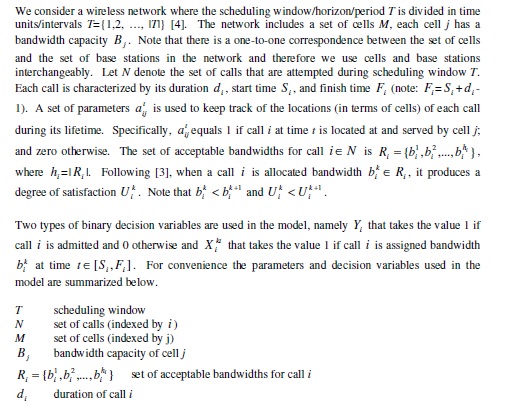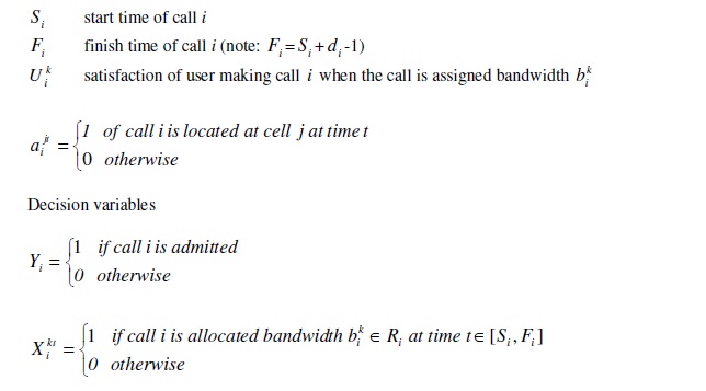 The objective function maximizes the total satisfaction of admitted calls. Constraints in set (2) ensure that an acceptable bandwidth is allocated to each admitted call in each time unit of the duration of the call. They also guarantee a zero tolerance call dropping policy; that is, once a call is admitted it is never dropped because of lack of bandwidth. Constraint set (3) represents the cell bandwidth capacity constraints; it ensures that the total bandwidth allocated to admitted calls in a cell does not exceed the bandwidth capacity of the cell. Constraint sets (4) and (5) are the binary integer constraints.