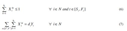 Constraint set (6) ensures that at most one acceptable bandwidth level is selected for each call in each time unit of the duration of the call. Constraint set (7) can be seen as the aggregation of the constraints (2); they set the number of acceptable bandwidth levels to be selected for an admitted call to the length (in terms of time units) of the duration of the call (di).