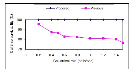 Finally, Figure 5 depicts the call time survivability for admitted calls for both methods as a function of the call arrival rate. The figure shows clearly the superiority of our proposed method over the previous one. Indeed, our method guarantees that an admitted call would last for its entire duration because it never gets dropped; whereas the call time survivability drops significantly for the previous method as the call arrival rate increases. Indeed, using the previous method, when the call arrival rate is 0.2, a call survives on average for only 95.28% of its duration and when the call arrival rate is 1.5, a call survives on average for only 76.78% of its duration. This obviously creates a higher degree of dissatisfaction among network users.