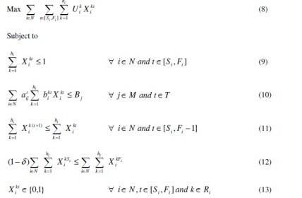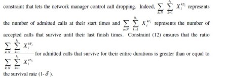 The objective function (8) maximizes total satisfaction of accepted calls. Constraint set (9) ensures that at most one acceptable bandwidth level is selected for each admitted call in each time unit of the duration of the call. Constraint set (10) represents the usual bandwidth capacity constraints. Constraints in set (11) ensure that if a call is dropped at a particular time, it is automatically dropped for the remainder of its normal duration. Constraint (12) is the policy