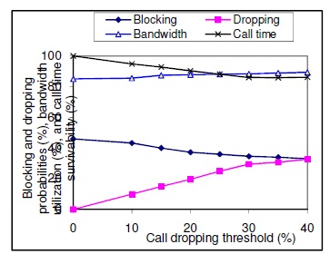 We conducted a simulation to study the effect of call dropping policy on key network performance measures. Figure 6 shows call blocking and dropping probabilities, bandwidth utilization, and call time survivability (as percentages) as a function of call dropping threshold using a fixed call arrival rate (0.5 calls/second). As expected, call blocking probability decreases, call dropping probability increases, and call time survivability drops when the call dropping threshold (δ) increases. For instance, when δ = 0 the call blocking probability is 46% and the call dropping probability is zero and when δ = 40% the call blocking probability is 33% and the call dropping probability is 32.84%. The call dropping threshold seems, however, to have insignificant effect on bandwidth utilization. Indeed, when δ = 0 the average bandwidth utilization is 85% and when d =40%, the average bandwidth utilization is around 89%. This gain in bandwidth utilization is to small to justify the surge in call dropping probability and the decline of the call time survivability. Therefore, we recommend that the call dropping threshold be set to zero and hence guarantee that an admitted call is never dropped during its lifetime as proposed by our original model (section 2), i.e., zero call dropping tolerance.