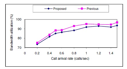 Figure 4 shows the cell bandwidth utilization for both methods as a function of the call arrival rate. Both methods utilize bandwidth more efficiently when more calls arrive to the networks. For the same call arrival rate, the previous method utilizes bandwidth slightly more efficiently than our proposed method. For example, when the call arrival rate is 1.5, bandwidth utilization is 93.52% for our method and 96.82% for the previous method. This small advantage of the previous method is achieved, however, at the significant expense of user satisfaction as the previous method ends up dropping as many as 43% of the admitted calls, whereas our method does not drop any admitted calls.