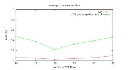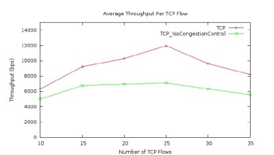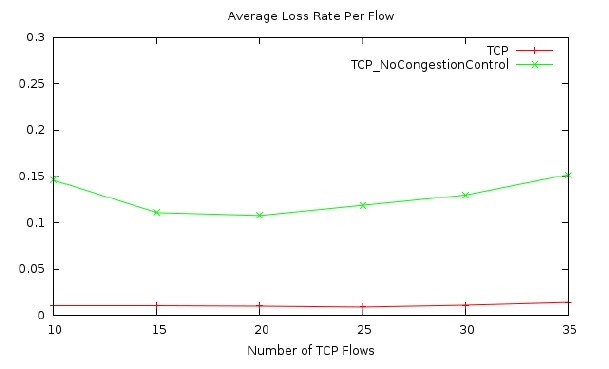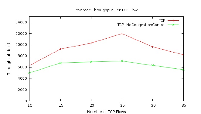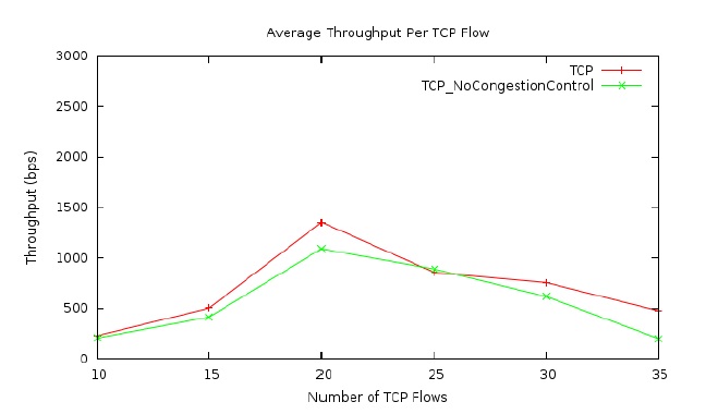 Figures 2 to 4 show the results for TCP flows in the UAV network using the free space link model. Figure 2 presents the average TCP flow rate in the network versus the number of TCP flows in the network. As mentioned earlier, the number of TCP flows varies from 10 to 35 in our simulations. There are two lines in the figure. One is for the TCP protocol with its congestion control enabled, while the other is for the TCP protocol with its congestion control disabled. As shown in the figure, the average TCP flow rate, in general, increases first with the increase of the number of TCP flows in the network and then starts to decease as the number of TCP flows increases further. This trend is true for both cases shown in the figure, with congestion control and without congestion control. However, one thing is obvious in Figure 2 is that when the TCP congestion control is disabled for the flows in the network, the average TCP flow rate is significantly lower. Therefore Figure 2 shows that TCP congestion control does improve the network performance in the case of our UAV network with free space link loss model.