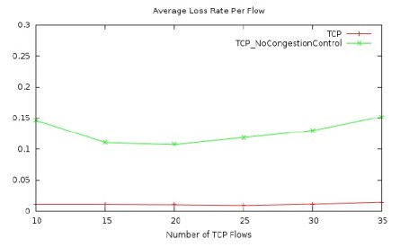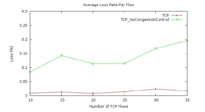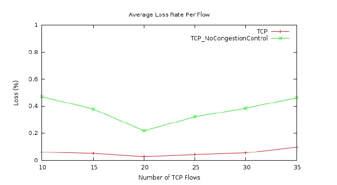The results in Figure 2 are corroborated by the results shown in Figures 3 and 4. Figure 3 shows the average packet delay in the network using the free space link model. The average package delay, in general, increases with the number of TCP flows in the network because the traffic load is higher when there are more TCP flows in the network. Moreover, when the congestion control of TCP is disabled, the average packet delay is much higher than that when the congestion control is enabled. These delay results thus corroborate the throughput results shown earlier. Figure 4 presents the average packet loss rate for TCP flows in the network using the free space link model. As shown in the figure, the packet loss rate, in general, increases when there are more TCP flows in the network because a higher traffic load results in more and severer congestion events in the network. As in the case of average packet delay, the average packet loss rate is much higher when the TCP congestion control is disabled in the network. These packet loss results thus also demonstrate that TCP congestion control does improve the network performance in a UAV network where the free space link model is used, as the flow throughput and packet delay results show earlier.