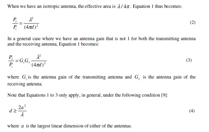 where r P is the signal power at the receiving antenna, t P is the signal power at the transmitting antenna, r A is the effective area of the receiving antenna, t A is the effective area of the transmitting antenna, d is the distance between the transmitting antenna and the receiving antenna, and l is the wavelength of the signal When we have an isotropic antenna, the effective area is l / 4p . Equation 1 thus becomes: