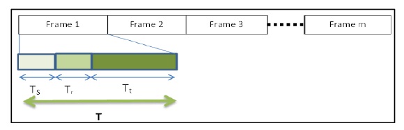 We assume that each CR node is provided with a single transceiver. Therefore, the CR cannot transmit and sense at the same time. Consequently, CR needs periodic spectrum sensing, Figure 2 shows the frame structure. Frame duration (T) is divided into three slots, these are: sensing, reporting and transmission. 1. Sensing slot (Ts): when N CRs sense the spectrum and collect energy samples. At sensing time, none of the NT CRs is allowed to transmit on the same channel because we assume energy detection where any measured energy will be considered as PU signal. Note that N can be ≤ NT. 2. Reporting slot (Tr): after the CRs make local measurements, they forward them to the fusion center. The CRs cannot report at the same time over one channel because the receiver is common. Thus, we consider consecutive reporting based on TDMA scheme, where each user has its own reporting time slot. 3. Transmission slot (Tt): if the channel is decided to be unused, one or multiple CRs are scheduled for data transmission.