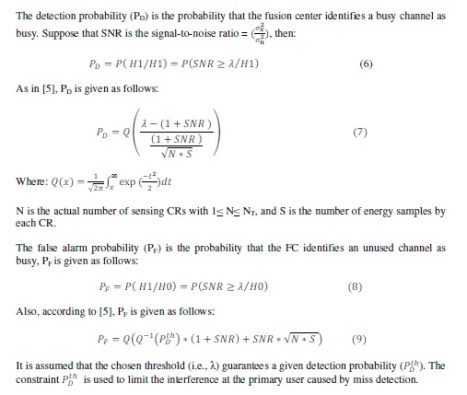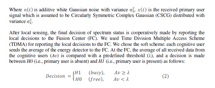 Each of the cooperative CRs is supposed to employ an energy detector and measures the received power on the channel during the sensing period. In energy detection, each CR collects energy samples, where the signal observed y(t) by each CR is as in Equation 1.
