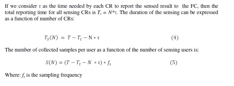 There is also a tradeoff between the selected N and Ts from one side and the achieved throughput from the other side. Increasing the number of sensing users leads to a higher accuracy in the received sensing results, which improves the achievable throughput. On the other hand, larger number of sensing users consumes more time in reporting process. This will decrease room left for transmission and as a result throughput is decreased as indicated in Equation (15). Also, increasing the sensing time for each user leads to increase the number of energy samples which improves the accuracy of sensing results. On the other hand, more energy samples will decrease the transmission time, which decreases throughput, Equation (15). Therefore, it is necessary to select Ts and N so that, the throughput is maximized.