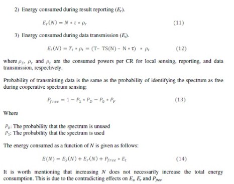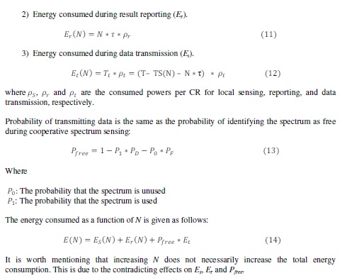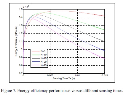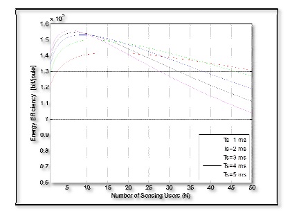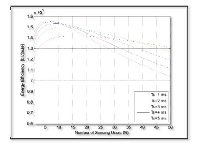 Figure 6 shows the energy efficiency versus the number values of Ts. Figure 7 shows the energy efficiency versus the sensing time presented for multiple values of N. Notice that the maximum energy efficiency is achieved at a low value of increases as Ts increases; we can clearly note that there is an number of sensing CRs for each number of available sensing time and the number of energy efficiency.