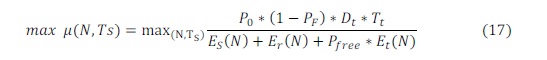 Energy efficiency is defined as the ratio of throughput to energy consumption. Therefore, maximizing it achieves the balance point between energy consumption and average throughput. Energy efficiency, as defined in Equation (16) can be maximized as follows: