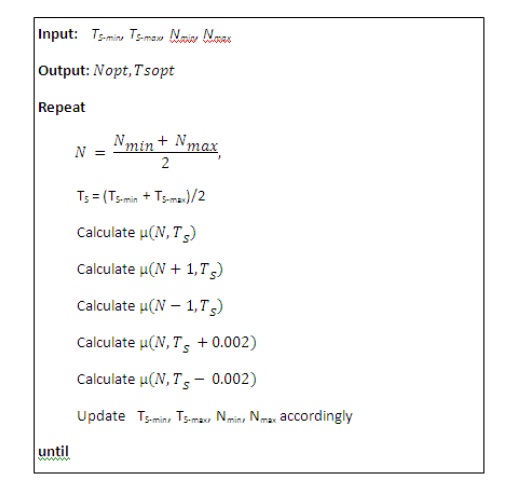 We are going to find N and TS which maximize the energy efficiency. To solve this maximization,we will use the bisection algorithm. The procedure of the proposed algorithm is illustrated using the pseudo code shown in Figure 3, where Z refers to the energy efficiency, NOPT is the optimal number of sensing CRs, and Tsopt is the optimal sensing time for these sensing CRs. Nmin, Nmax,Ts-min and Tsmax are the boundary values of number of sensing users and sensing time respectively.