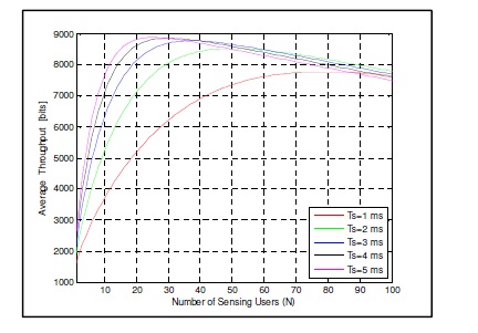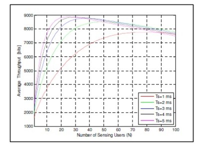 Simulation parameters are listed in Table 1. Average throughput versus the number of sensing users is presented in Figure 4, for multiple values of sensing time at a fixed detection probability Pr = 0.9. Note that in the first part of each curve, as N increases, the number of collected energy samples increases because number of sensing users is increased. More energy samples means longer sensing time, which leads to PF decrease and increase in the probability of transmitting data, which in turn increases the throughput. However, the throughput curves will not keep increasing. They will decrease again because as number of sensing CRs increases, reporting time (Tr)increases. Since the frame structure is limited, when Tr increases, Tt decreases,and therefore the throughput decreases. It is necessary to optimize the number of sensing users. Note that the maximum average throughput occurs at N=23 when Ts=1ms. However, the maximum average throughput is dependent on multiple factors as shown in the figure which is dependent Ts, N, and other simulation parameters. Therefore, the optimal point is different and