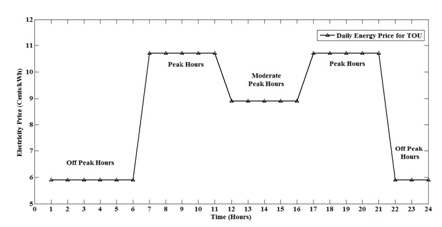 In our simulation, refer to the Hydro Ottawa daily energy price of TOU in winter condition [16], it is illustrated in Figure 4. Wherein, one day has been divided into three different durations: peak hours from 7 am to 11am and from 5 pm to 9 pm, mid-peak hours from 11 am to 5 pm, and the rest of time in one day is off-peak hours. Meanwhile, the respective energy price is 10.7 cents/kWh in peak hours, 8.9 cents/kWh in moderate hours, and 5.9 cents/kWh in off peak hours.