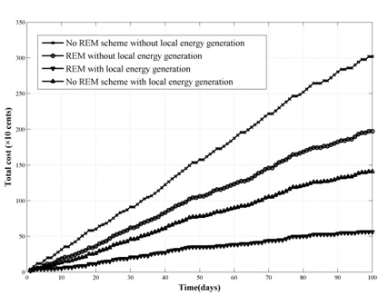 In Figure 5, it compares the total cost of one home within 100 days in four different cases. It testifies the efficiency of ICN-REM scheme for ICN-HOMENET system and it also shows the significance of local energy generation for customers’ bills. Note that total cost increase with increasing days because the bill is calculated cumulatively. As seen in Figure 5, the cost of customer with ICN-REM and local energy is more than 5 times than customers without them. Moreover, it demonstrates that shifting the appliance to off-peak hours is an efficient way to decrease bills for TOU-aware energy system.